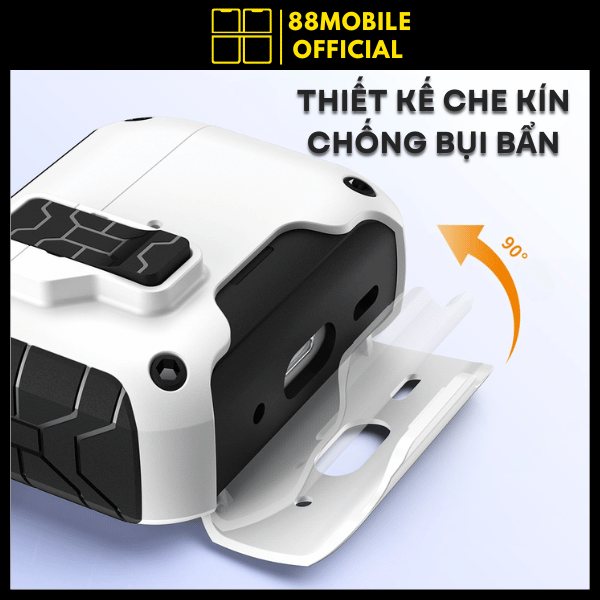 Phần nắp 90° che chắn cổng sạc và tai nghe.