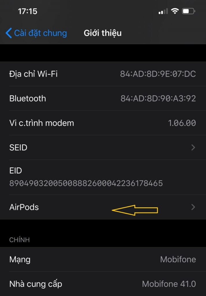 Các bạn kiểm tra thông tin tai nghe trong điện thoại iPhone của mình bằng cách : Nhấp vào Cài Đặt >> Cài Đặt Chung >> Giới Thiệu.