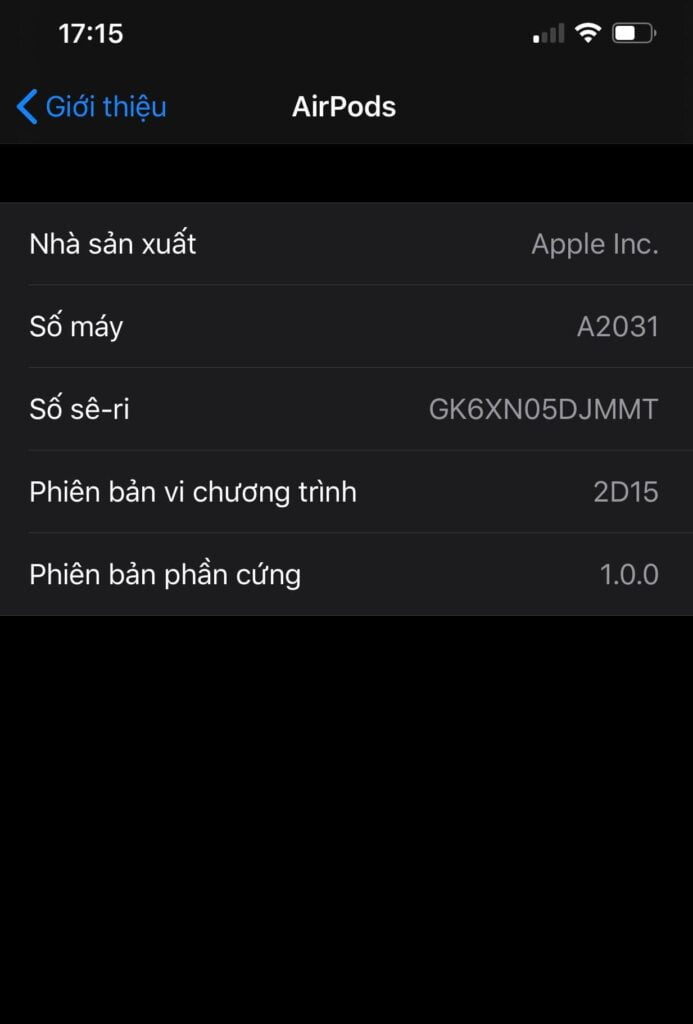+ Đối với tai nghe Zin : Trong phần Giới Thiệu bạn kéo xuống sẽ thấy thông tin Tai Nghe Airpod. Trong đó hiện đầy đủ thông số kĩ thuật như Số Máy, Số Sê ri, Phiên bản phần cứng, Phiên bản phần mềm